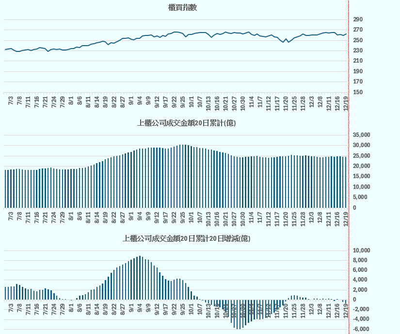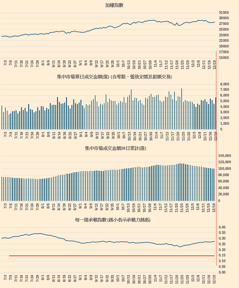 集中市場成交金額跟加權指數的對應。(留意每一億承載指數,越小表示承載力越低),概念來源 : 總大。