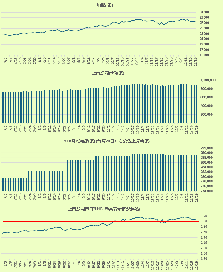「上市公司市值 / M1B金額」 與加權指數的對應。(留意上市公司市值/M1B ,越高表示市況越熱),概念來源 : 總大。