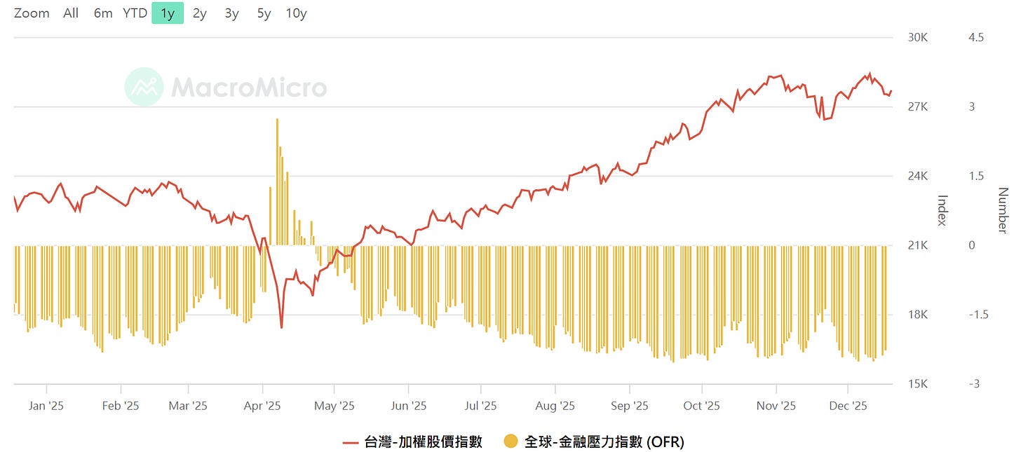全球金融壓力指數vs加權,資料來源:MacroMicro 財經M平方,留意壓力指數從低點開始往上攀升