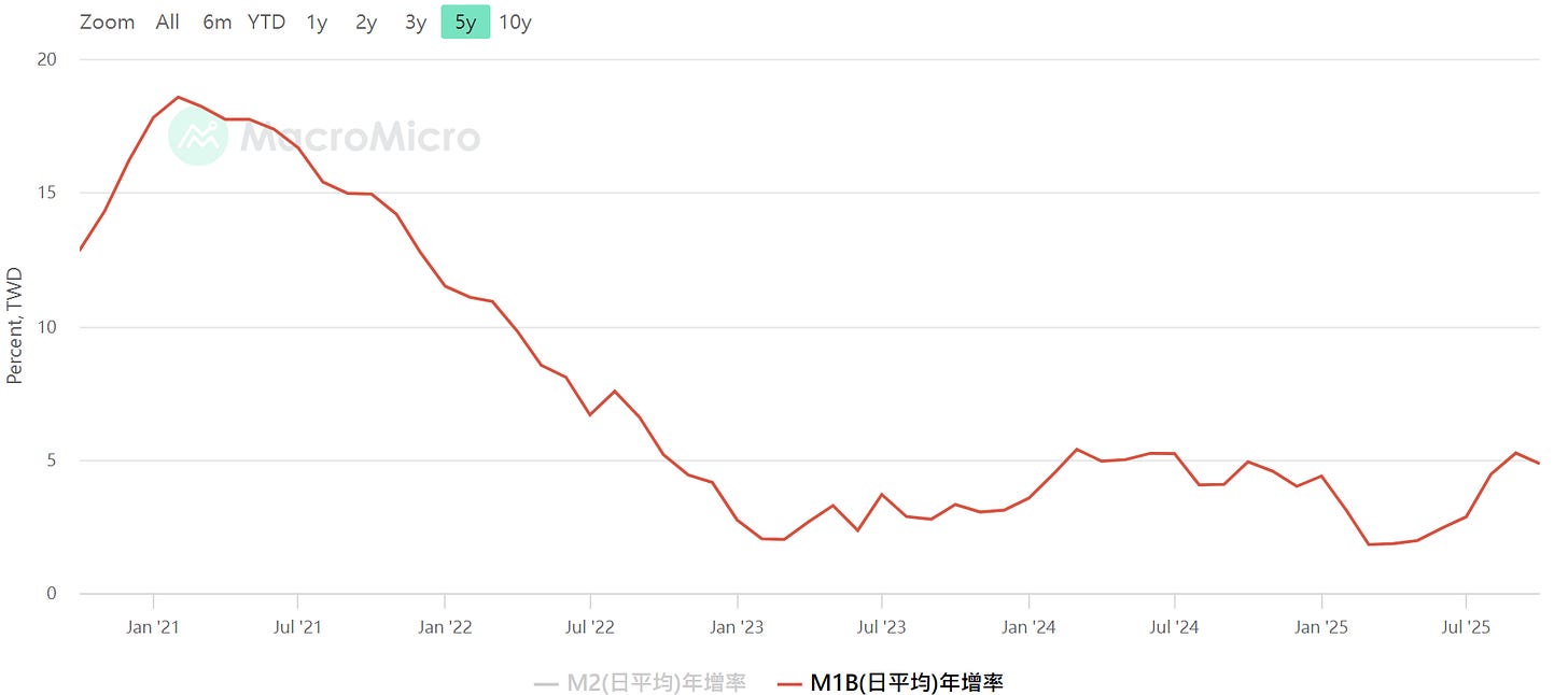 M1B年增率,若負值為警訊,資料來源:MacroMicro 財經M平方