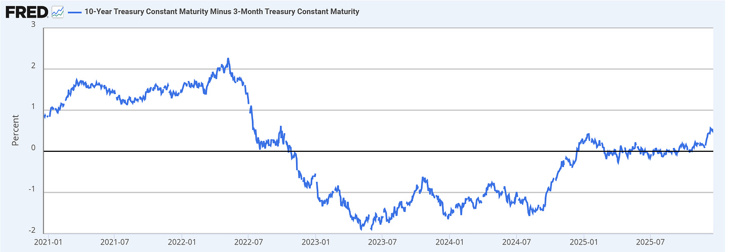 美10年債殖利率-3個月殖利率,資料來源:Fred