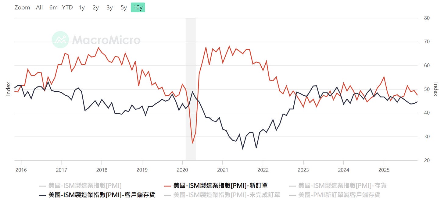 美國PMI新訂單,資料來源:MacroMicro 財經M平方,看「新訂單指數減客戶端庫存 (New Order - Customer’s inventory)」,透過這個相減指數,去抓客戶回補庫存的時機點,這才能跟上股市的 EPS 上修預期(參考美股韭菜王)。