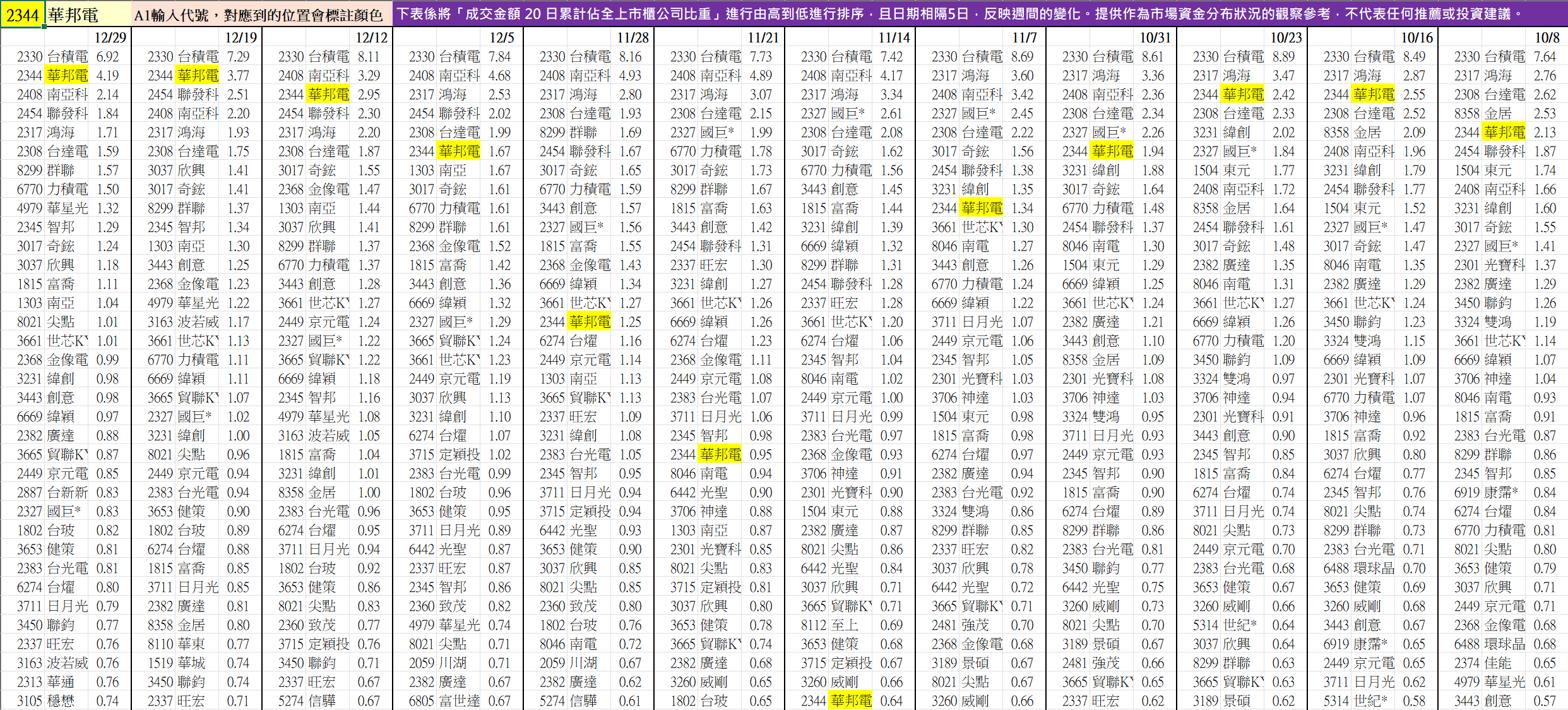 (舉例 : 2344華邦電,10/8-12/29的排名變化如下)