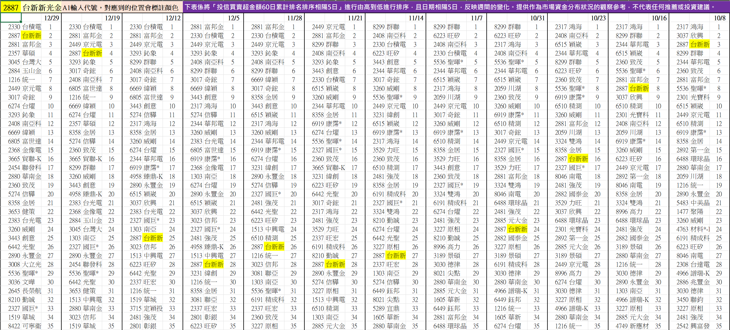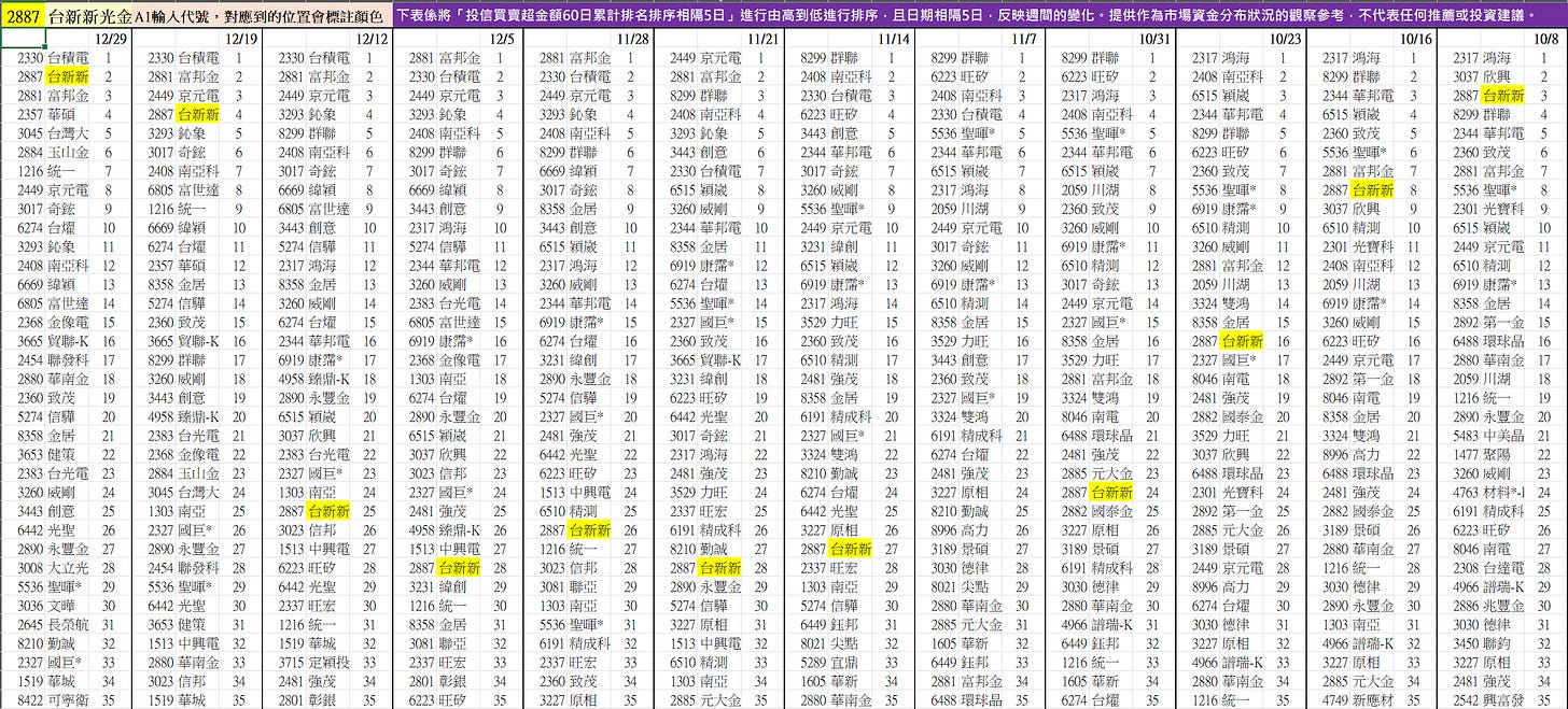 (舉例 : 2887台新金,10/8-12/29的排名變化如下)