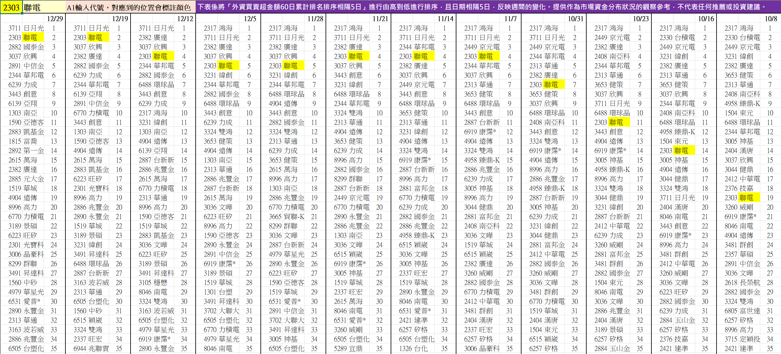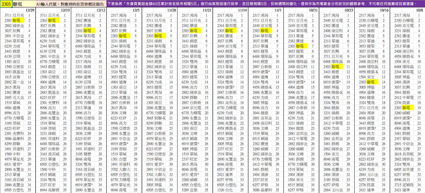 (舉例 : 2303聯電,10/8-12/29的排名變化如下)