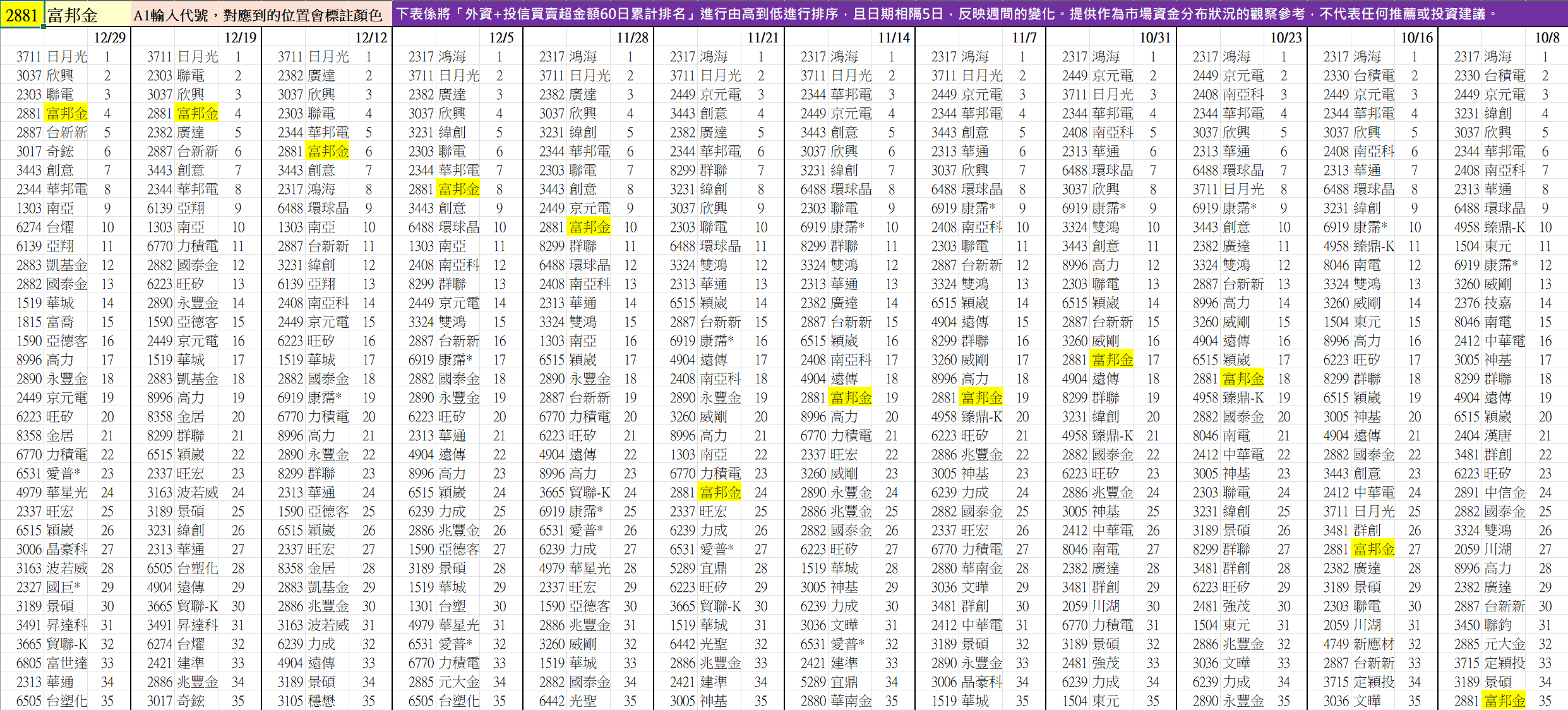 (舉例 : 2881富邦金,10/8-12/29的排名變化如下)