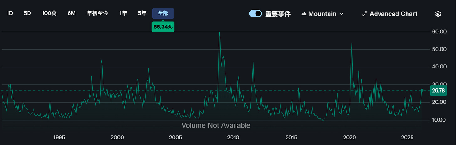 VIX :期權市場對未來 30 天標普 500 波動率預期,VIX長期平均約在19左右。若低於15,代表市場平靜;超過25,開始進入不安;若衝破30或40,多半是危機時刻,但它只能告訴你市場「表面的恐懼」,資料來源 : yahoo finance