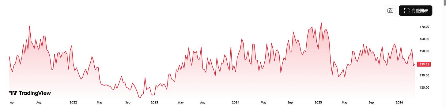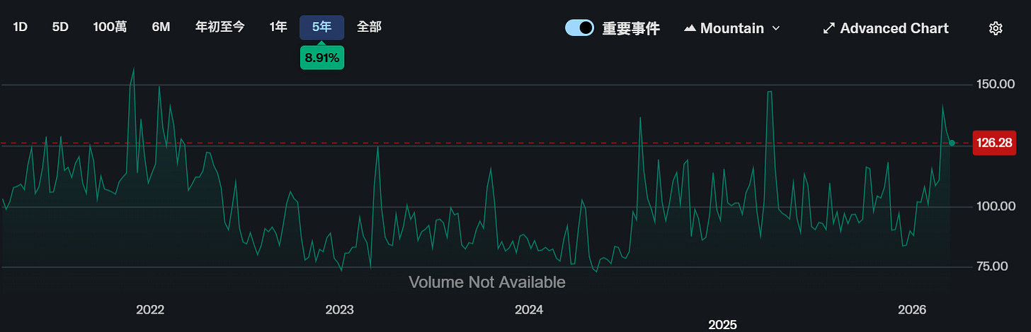 VVIX :如果 VIX 是「市場的恐懼」,那麼 VVIX 就是解讀為「市場對恐懼會增強的恐懼」,VVIX若在110-120,代表避險需求正在強化;若逼迫近150以上,市場已陷入「恐懼的波動」,資料來源 : yahoo finance