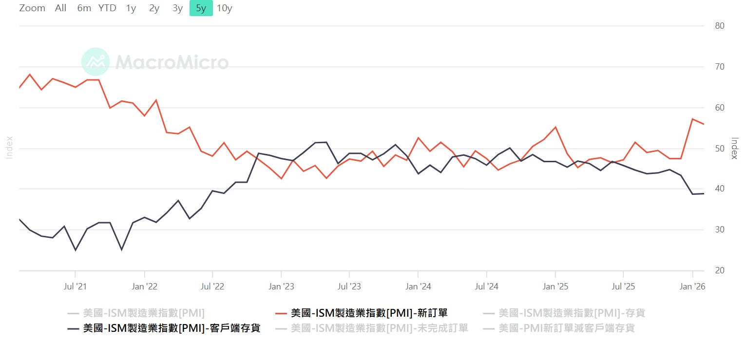 美國PMI新訂單,資料來源:MacroMicro 財經M平方,看「新訂單指數減客戶端庫存 (New Order - Customer’s inventory)」,透過這個相減指數,去抓客戶回補庫存的時機點,這才能跟上股市的 EPS 上修預期(參考美股韭菜王)。
