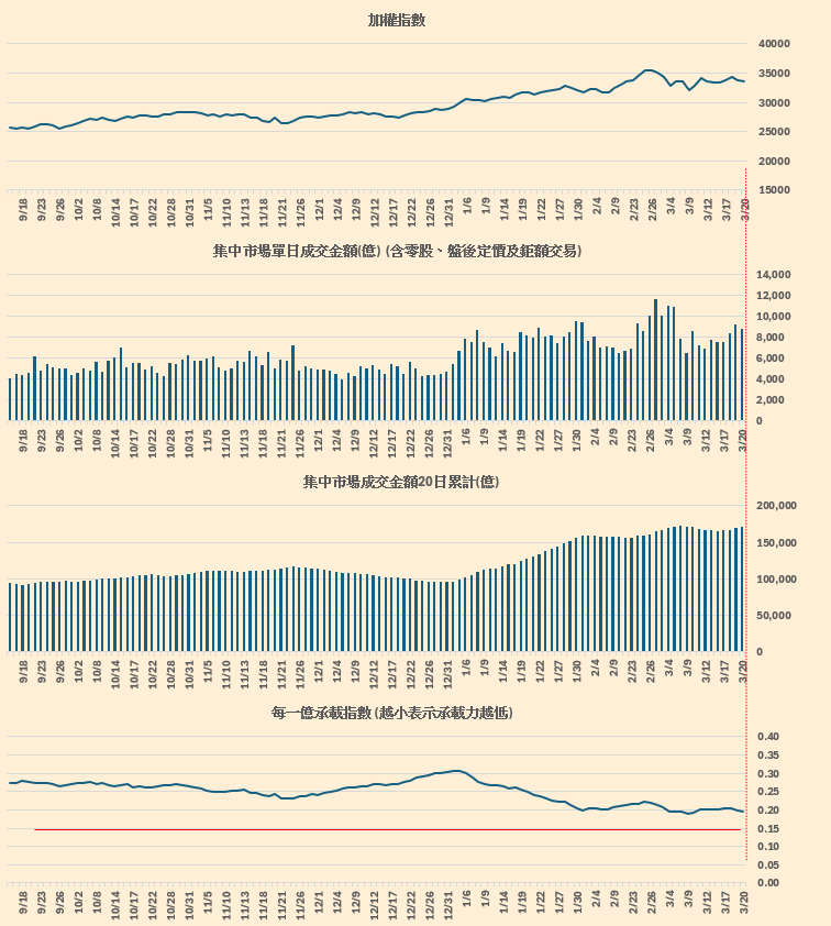 集中市場成交金額跟加權指數的對應。(留意每一億承載指數,越小表示承載力越低),概念來源 : 總大。