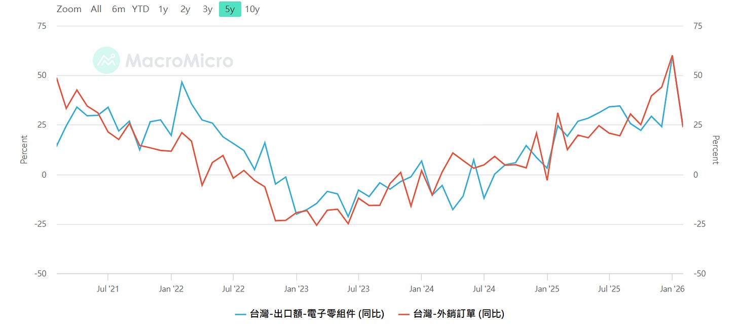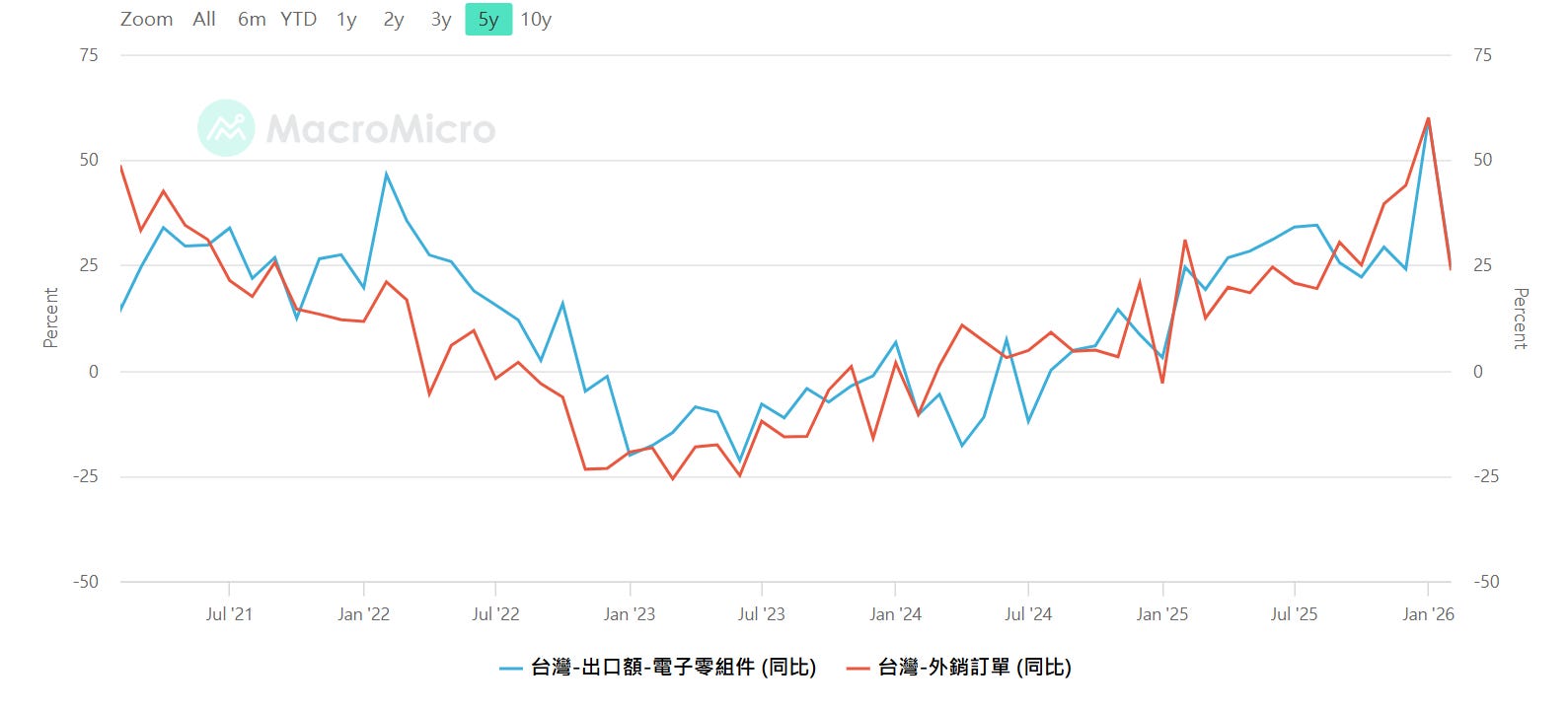 台灣-電子零組件出口(年增率) ,台灣-外銷訂單(年增率)注意高低點極值(-10~+20),資料來源:MacroMicro 財經M平方,SimonShih,財經雷說明