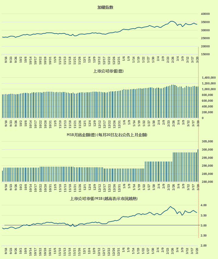 「上市公司市值 / M1B金額」 與加權指數的對應。(留意上市公司市值/M1B ,越高表示市況越熱),概念來源 : 總大。