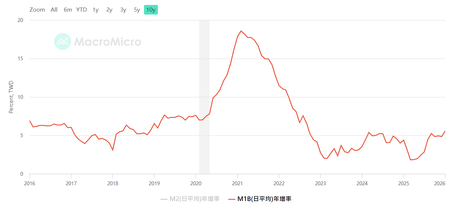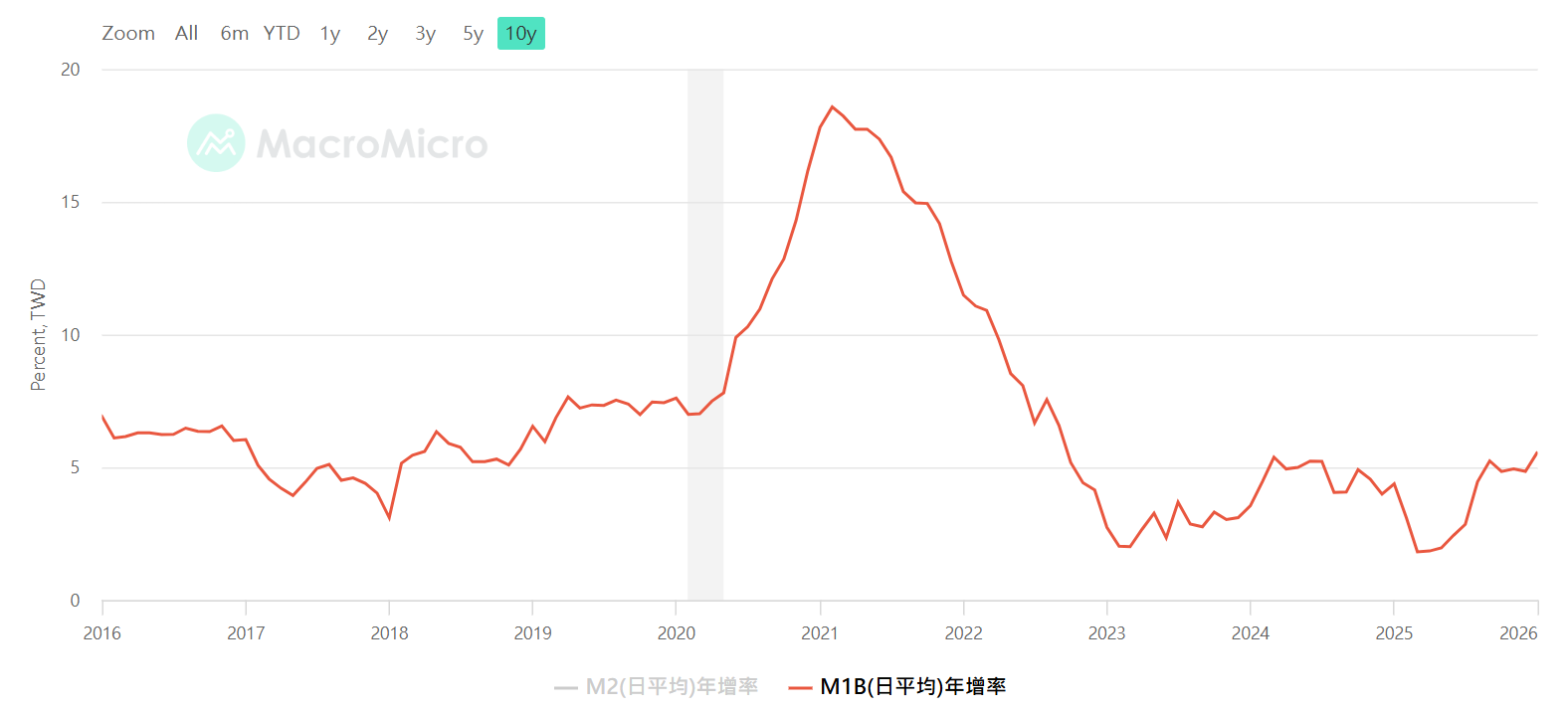 M1B年增率,若負值為警訊,資料來源:MacroMicro 財經M平方