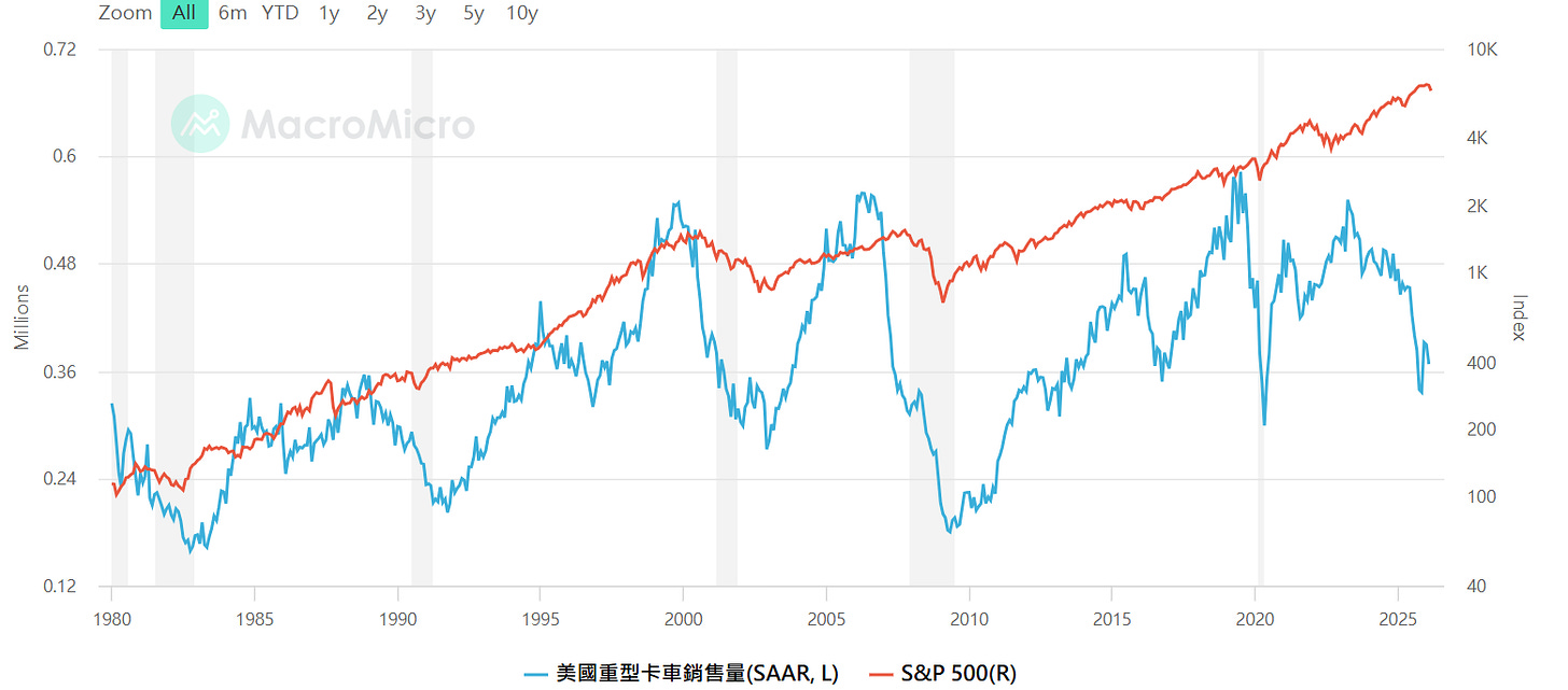 柯博文指數 (美國超過 6.35 公噸的卡車銷售量),資料來源 : MacroMicro財經M平方,智股網FB貼文連結