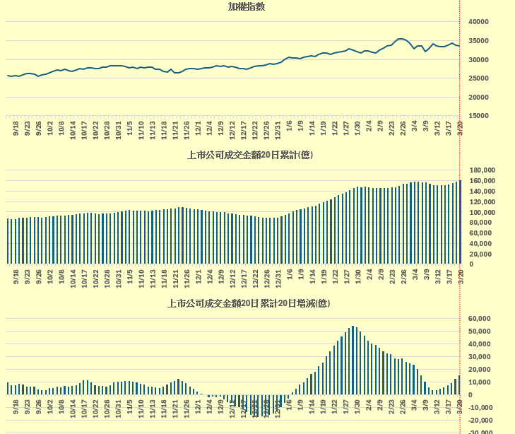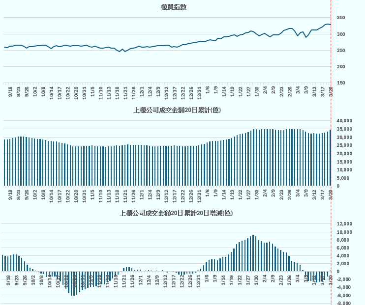 櫃買指數 vs 上櫃公司成交金額20日累計(億)