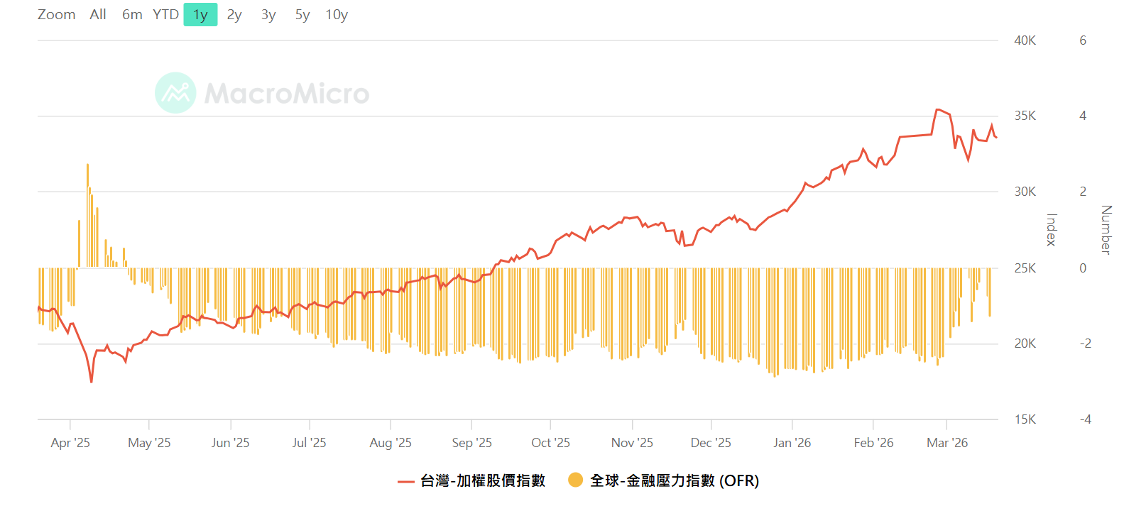 全球金融壓力指數vs加權,資料來源:MacroMicro 財經M平方,留意壓力指數從低點開始往上攀升