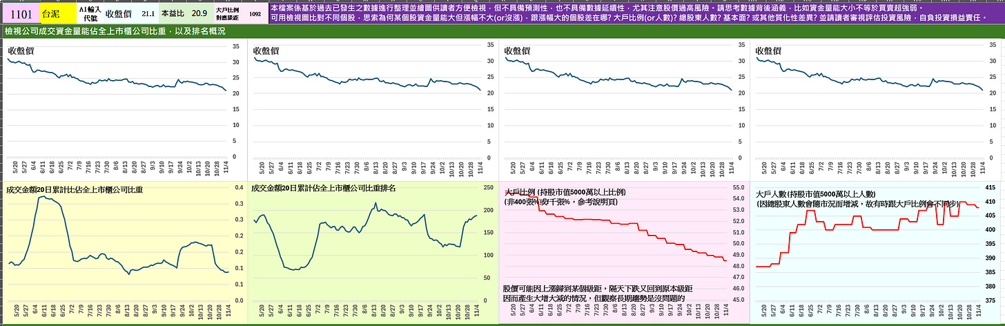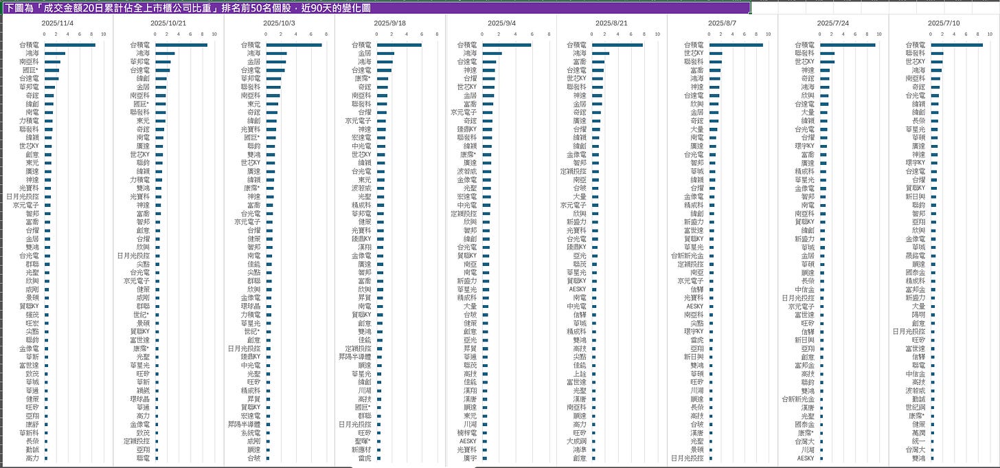 昨天閱讀一篇文章時,作者提到一種以「市場集中度」角度來觀察資金結構的方法,因此我嘗試製作了一張圖表,內容為「成交金額 20 日累計佔全上市櫃公司比重」排名前 50 名個股,於近 90 天的變化情況。