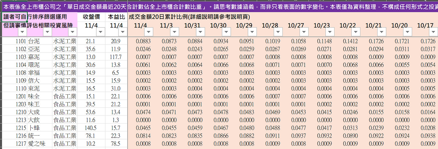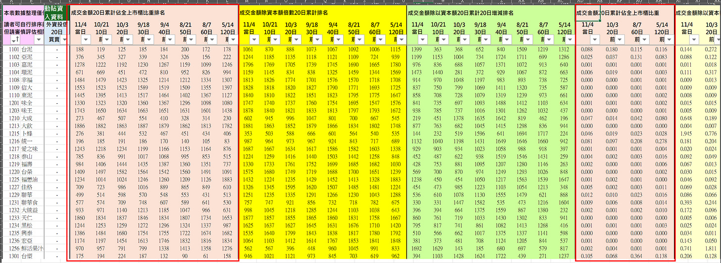 1.計算各上市櫃個股的「成交金額 20 日累計」(以下簡稱 A)