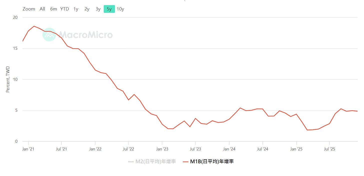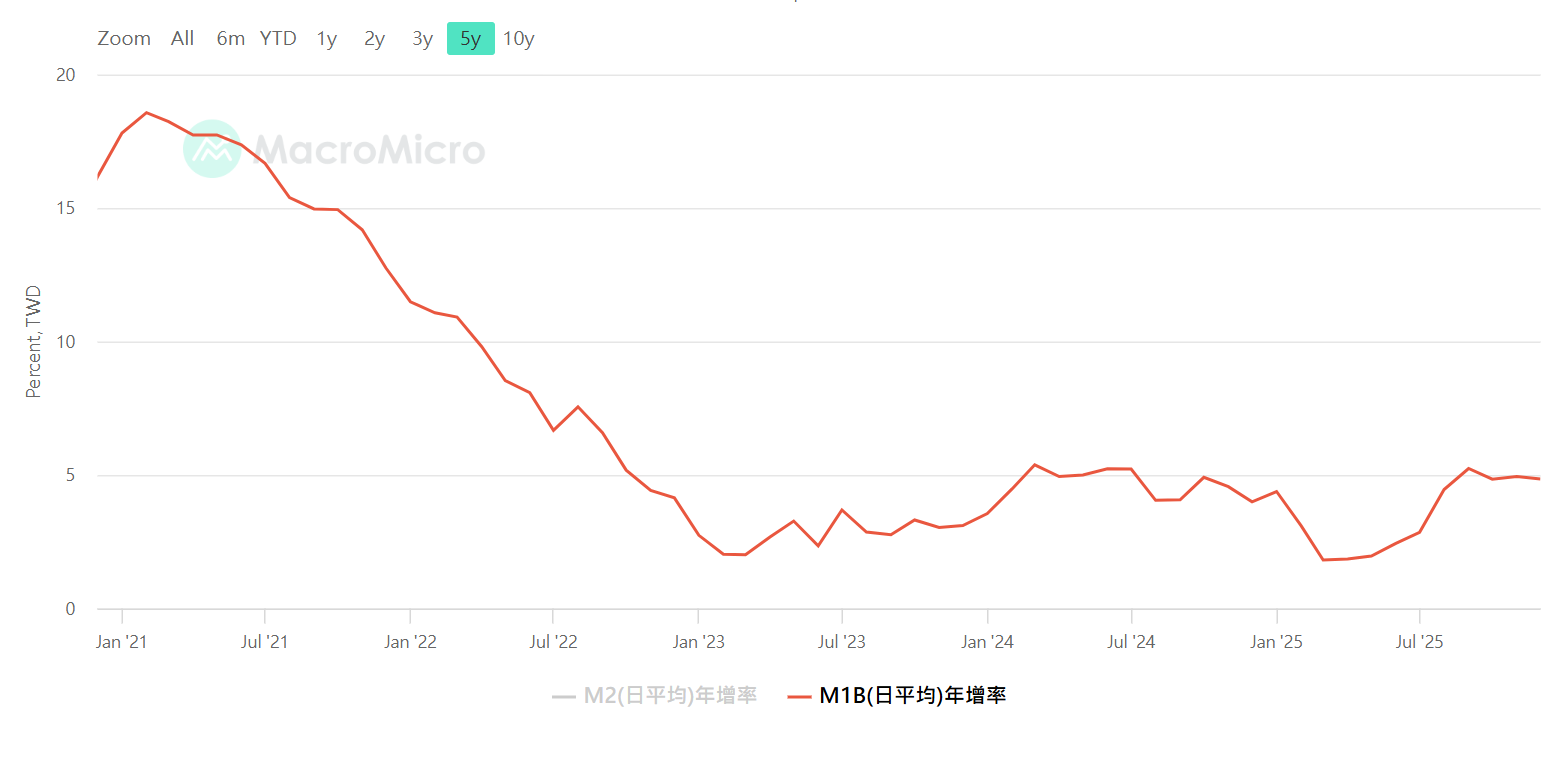 M1B年增率,若負值為警訊,資料來源:MacroMicro 財經M平方
