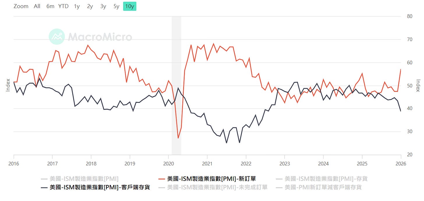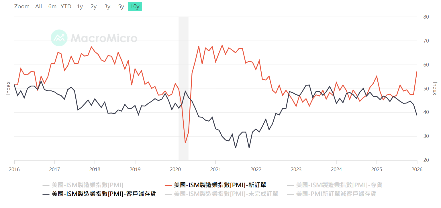 美國PMI新訂單,資料來源:MacroMicro 財經M平方,看「新訂單指數減客戶端庫存 (New Order - Customer’s inventory)」,透過這個相減指數,去抓客戶回補庫存的時機點,這才能跟上股市的 EPS 上修預期(參考美股韭菜王)。