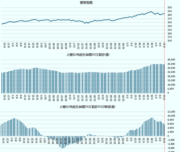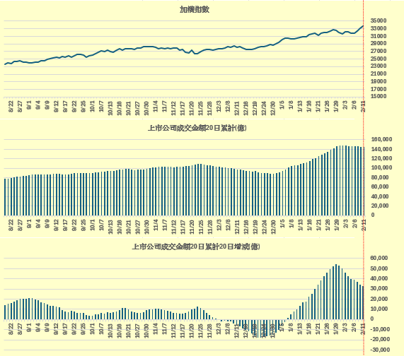 加權指數 vs 上市公司成交金額20日累計(億)