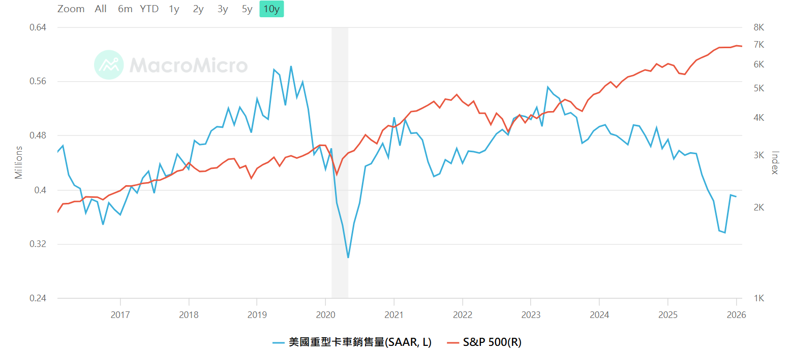 柯博文指數 (美國超過 6.35 公噸的卡車銷售量),資料來源 : MacroMicro財經M平方,智股網FB貼文連結