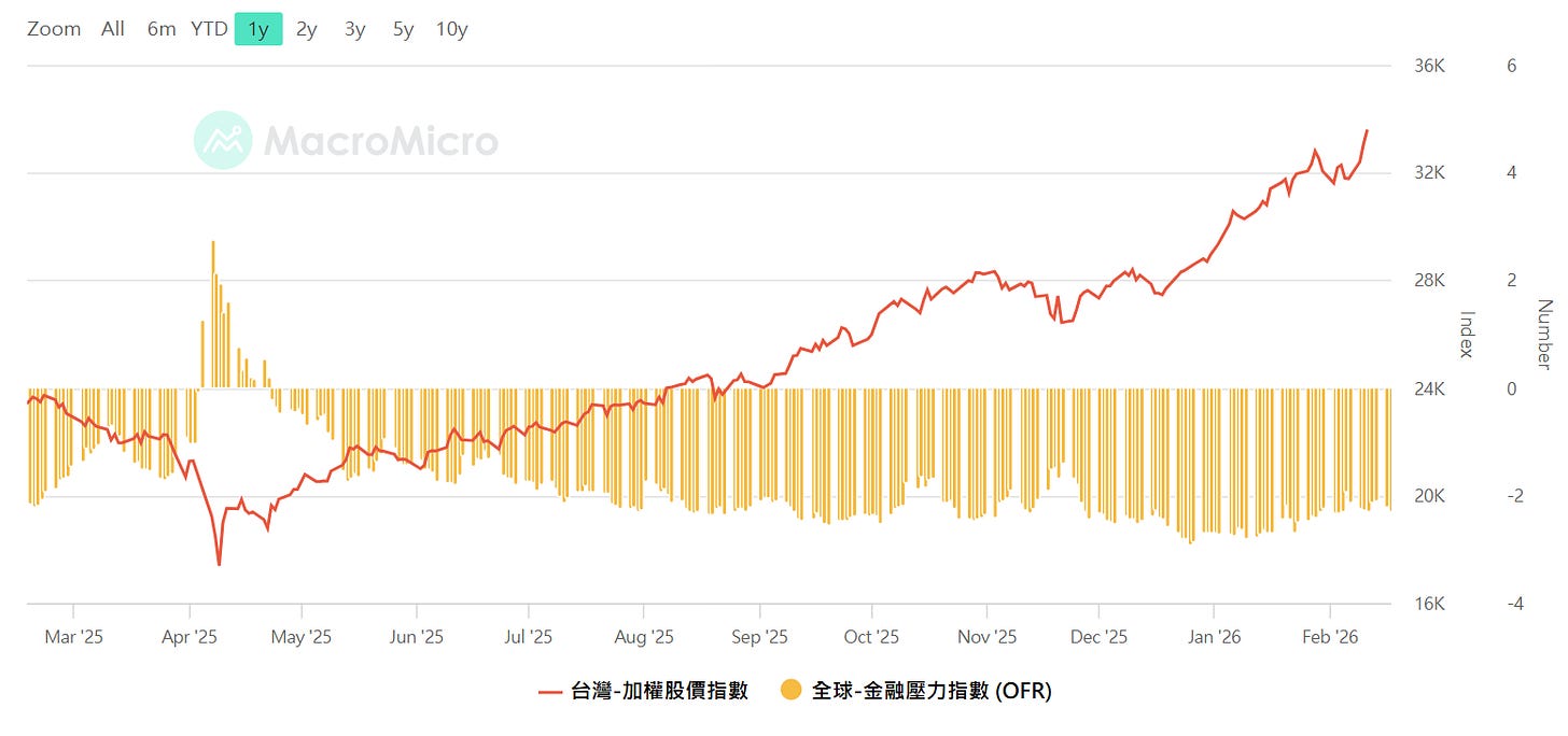 全球金融壓力指數vs加權,資料來源:MacroMicro 財經M平方,留意壓力指數從低點開始往上攀升