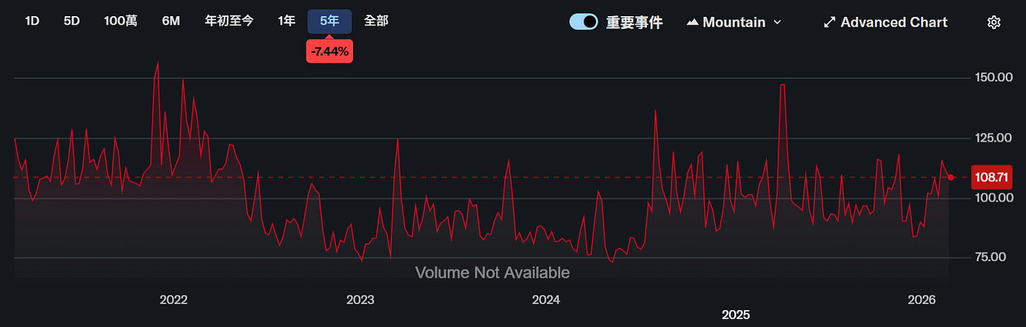 VVIX :如果 VIX 是「市場的恐懼」,那麼 VVIX 就是解讀為「市場對恐懼會增強的恐懼」,VVIX若在110-120,代表避險需求正在強化;若逼迫近150以上,市場已陷入「恐懼的波動」,資料來源 : yahoo finance