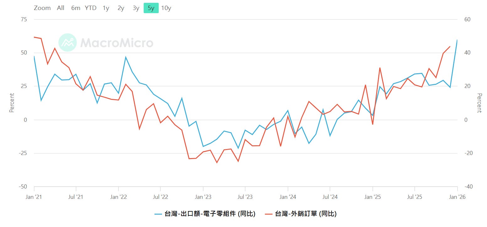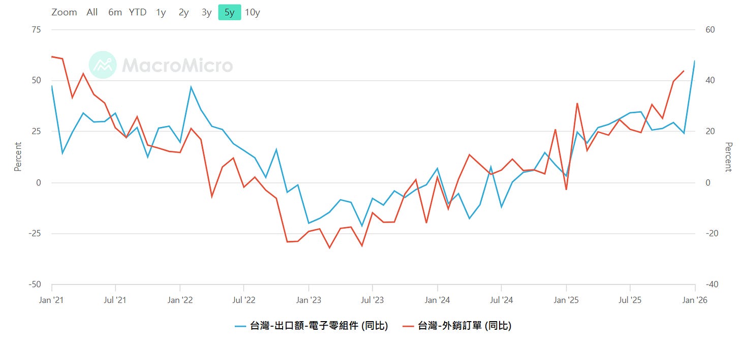 台灣-電子零組件出口(年增率) ,台灣-外銷訂單(年增率)注意高低點極值(-10~+20),資料來源:MacroMicro 財經M平方,SimonShih,財經雷說明