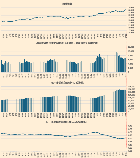 集中市場成交金額跟加權指數的對應。(留意每一億承載指數,越小表示承載力越低),概念來源 : 總大。