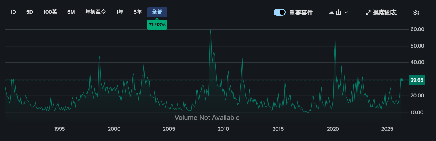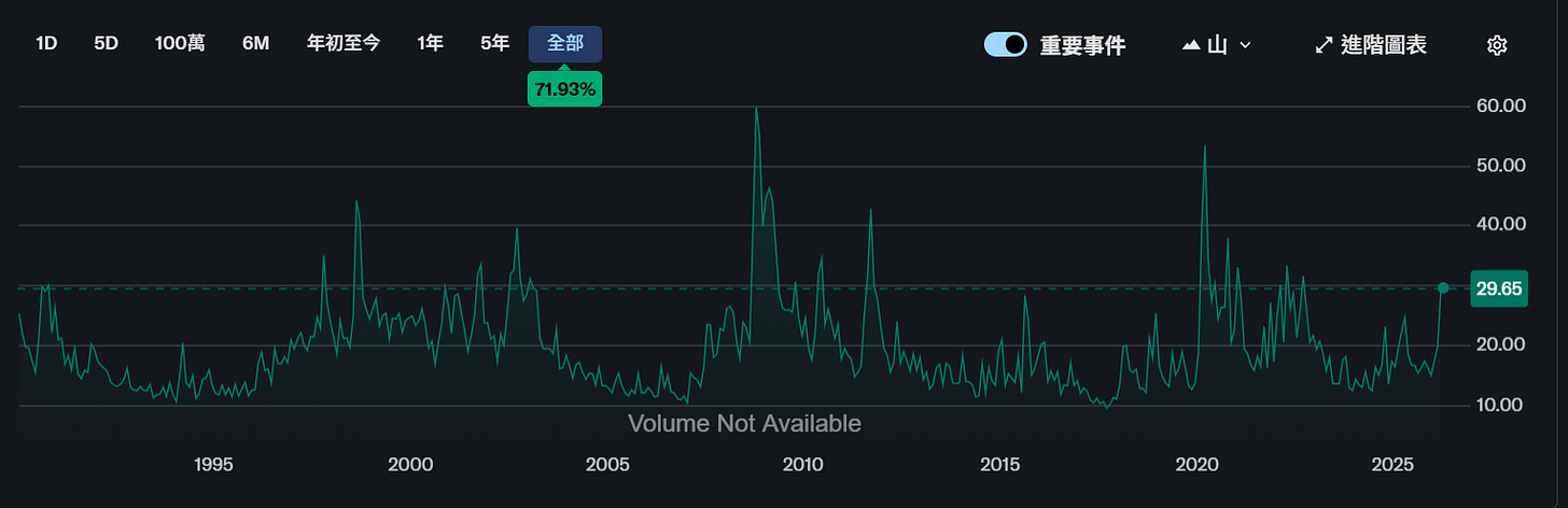 VIX :期權市場對未來 30 天標普 500 波動率預期,VIX長期平均約在19左右。若低於15,代表市場平靜;超過25,開始進入不安;若衝破30或40,多半是危機時刻,但它只能告訴你市場「表面的恐懼」,資料來源 : yahoo finance