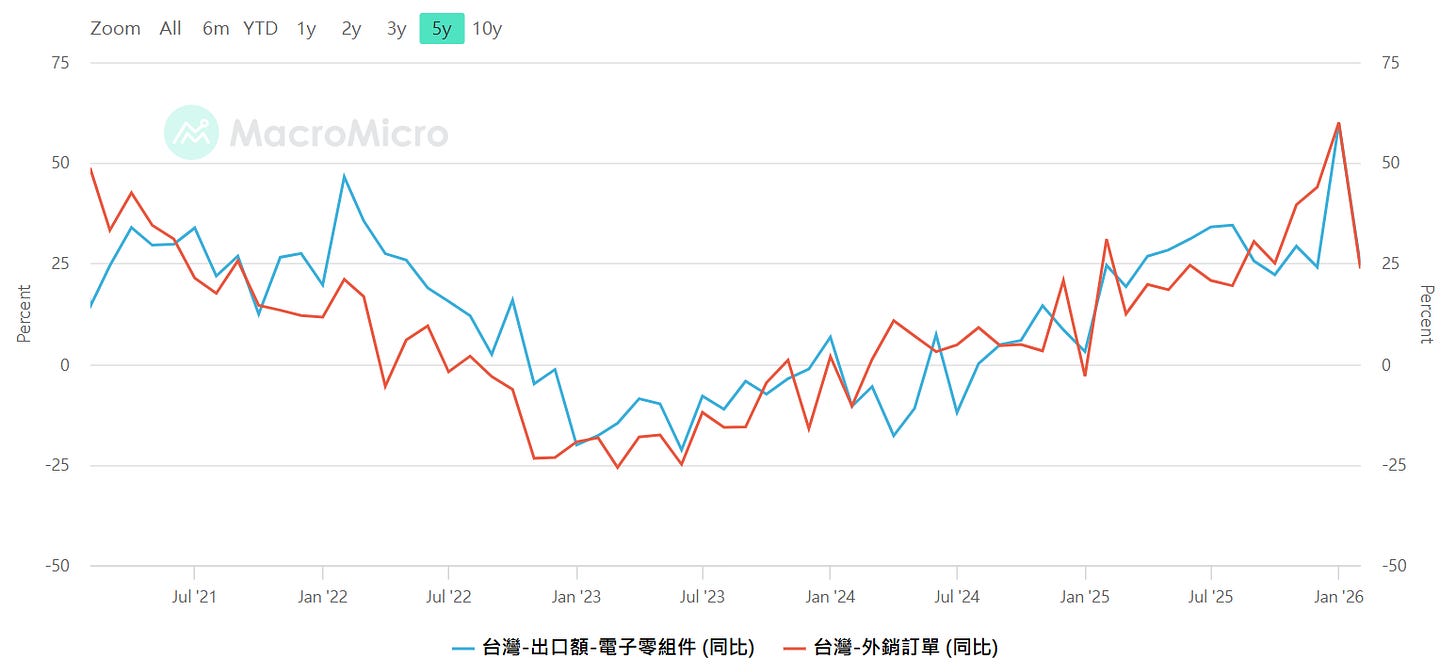 台灣-電子零組件出口(年增率) ,台灣-外銷訂單(年增率)注意高低點極值(-10~+20),資料來源:MacroMicro 財經M平方,SimonShih,財經雷說明