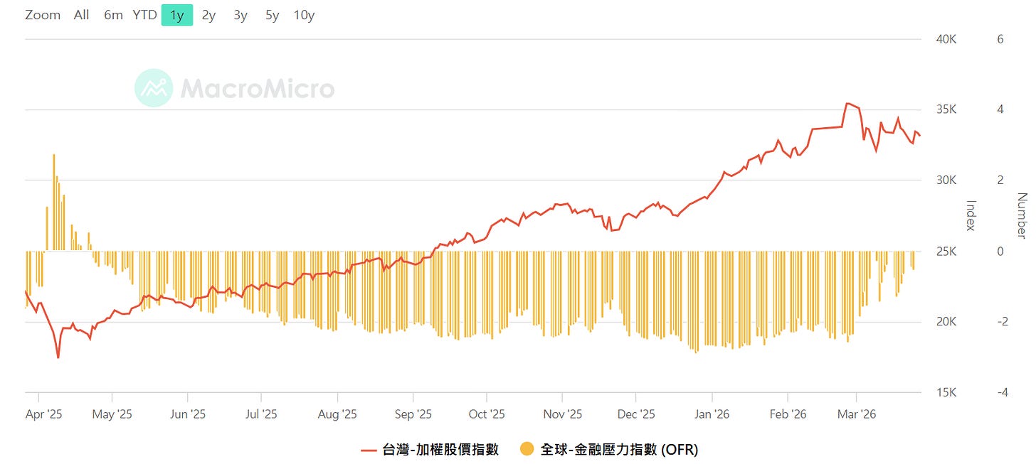 全球金融壓力指數vs加權,資料來源:MacroMicro 財經M平方,留意壓力指數從低點開始往上攀升
