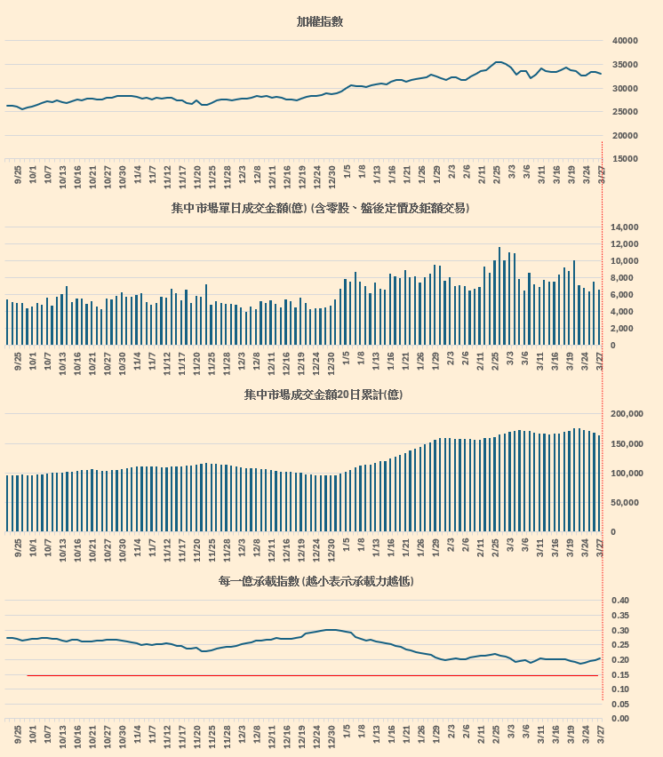 集中市場成交金額跟加權指數的對應。(留意每一億承載指數,越小表示承載力越低),概念來源 : 總大。