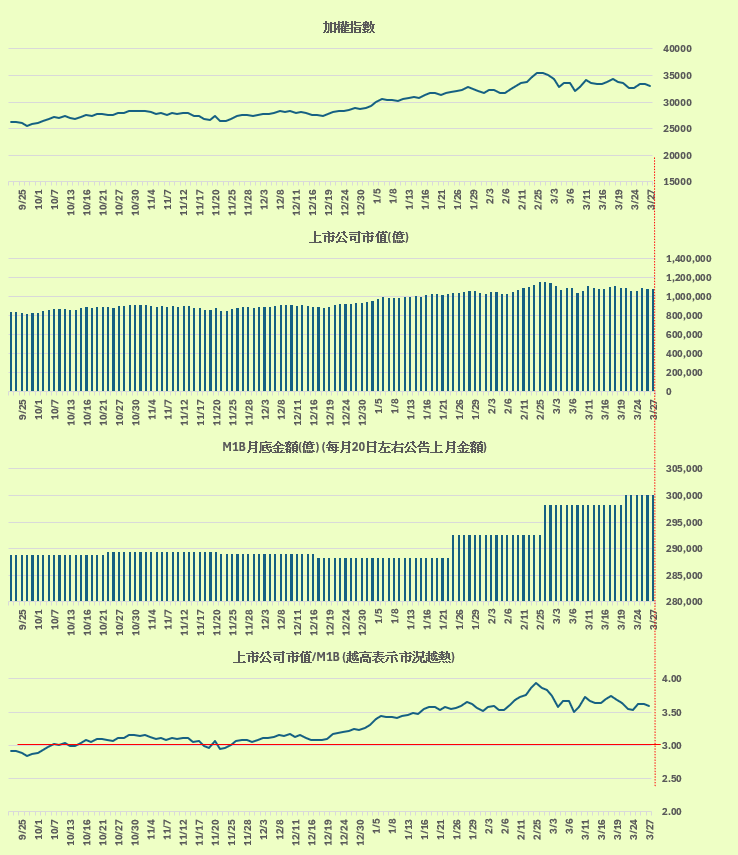 「上市公司市值 / M1B金額」 與加權指數的對應。(留意上市公司市值/M1B ,越高表示市況越熱),概念來源 : 總大。