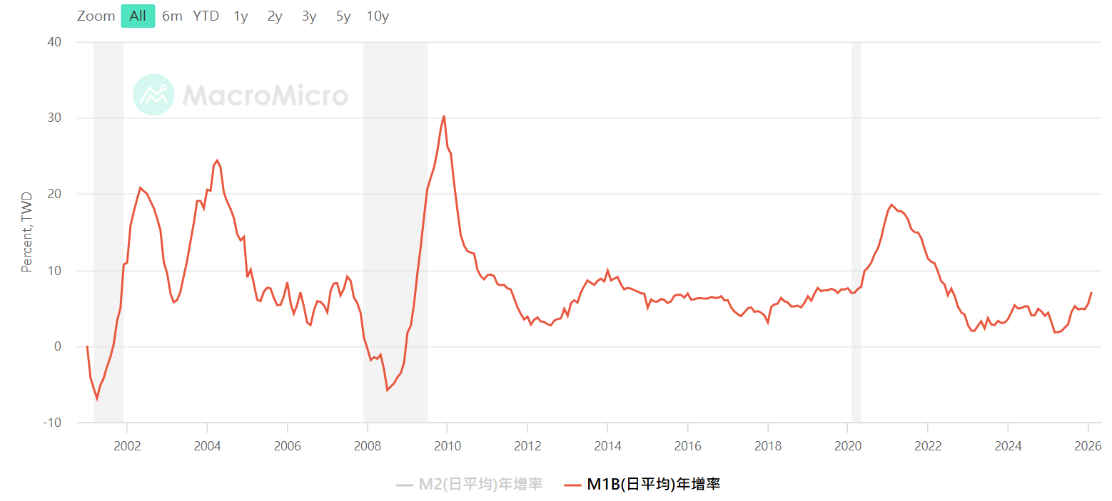 M1B年增率,若負值為警訊,資料來源:MacroMicro 財經M平方