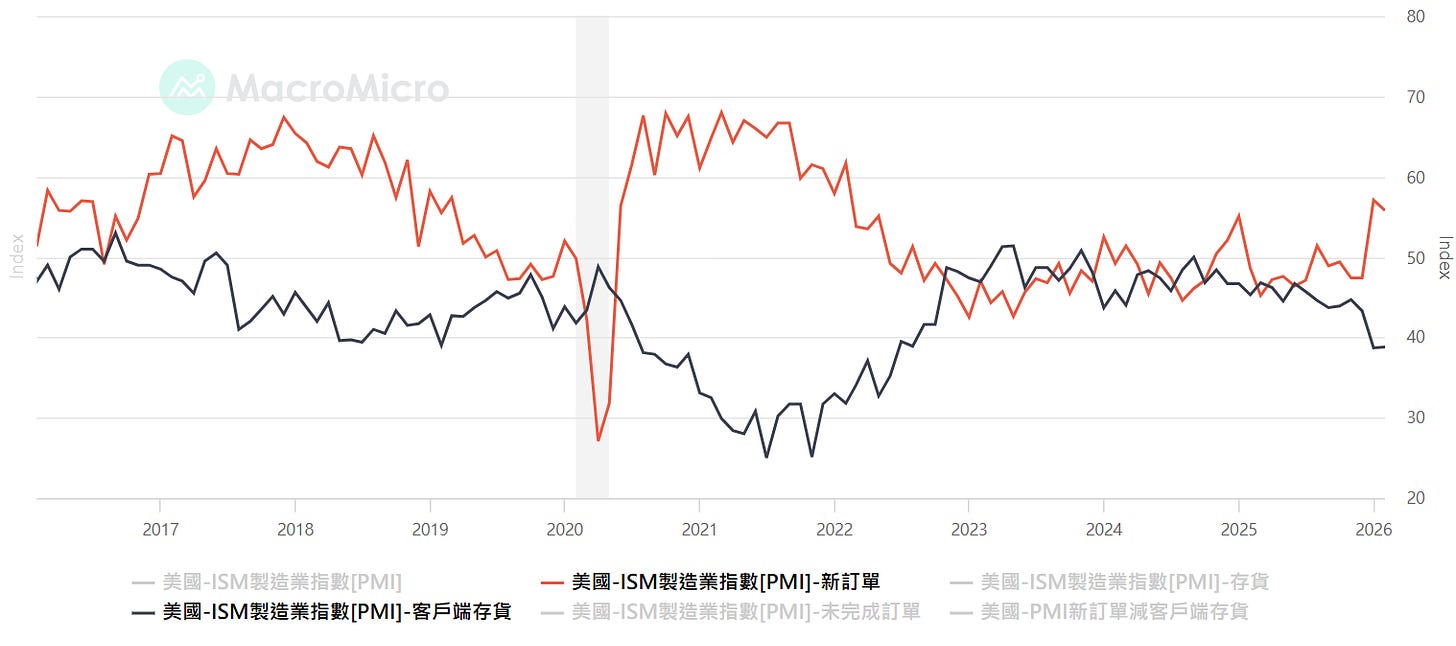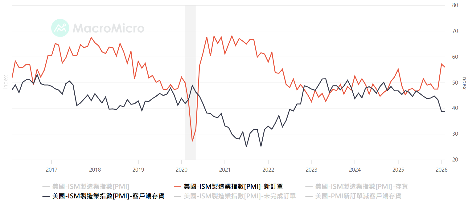 美國PMI新訂單,資料來源:MacroMicro 財經M平方,看「新訂單指數減客戶端庫存 (New Order - Customer’s inventory)」,透過這個相減指數,去抓客戶回補庫存的時機點,這才能跟上股市的 EPS 上修預期(參考美股韭菜王)。