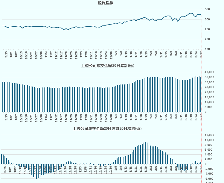 櫃買指數 vs 上櫃公司成交金額20日累計(億)