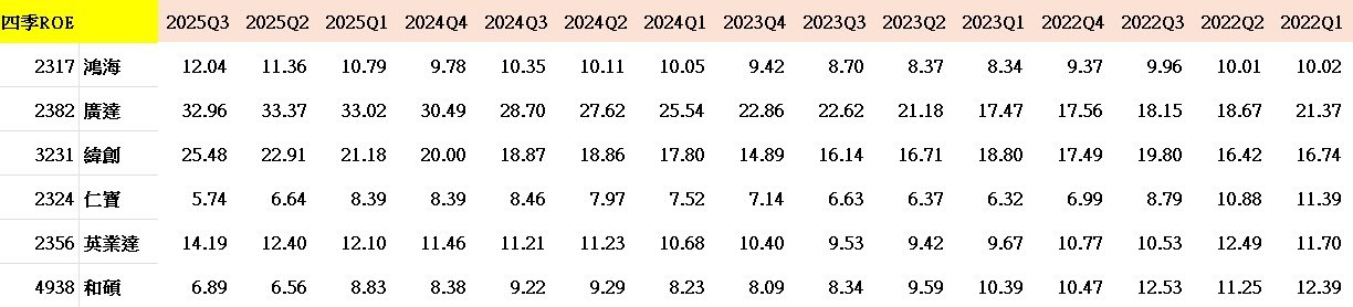 不過我們不需要過度悲觀,張會計師的文章提供了一個很棒的視角,讓我們重新認識這些大廠的價值,鴻海與電子五哥雖然毛利率不漂亮,但ROE多數並不差,其中廣達更常年維持在20%以上(2025年突破30%)