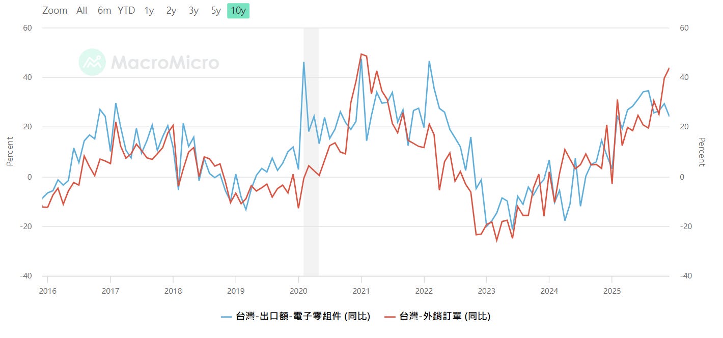 台灣-電子零組件出口(年增率) ,台灣-外銷訂單(年增率)注意高低點極值(-10~+20),資料來源:MacroMicro 財經M平方,SimonShih,財經雷說明