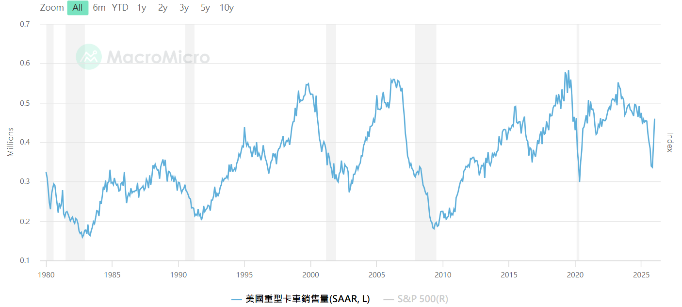 柯博文指數 (美國超過 6.35 公噸的卡車銷售量),資料來源 : MacroMicro財經M平方,智股網FB貼文連結