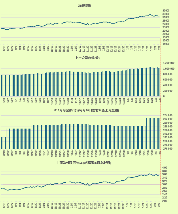 「上市公司市值 / M1B金額」 與加權指數的對應。(留意上市公司市值/M1B ,越高表示市況越熱),概念來源 : 總大。