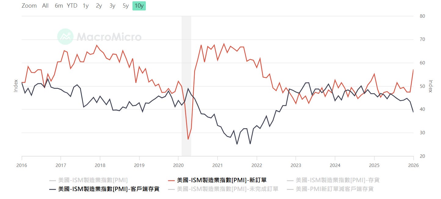 美國PMI新訂單,資料來源:MacroMicro 財經M平方,看「新訂單指數減客戶端庫存 (New Order - Customer’s inventory)」,透過這個相減指數,去抓客戶回補庫存的時機點,這才能跟上股市的 EPS 上修預期(參考美股韭菜王)。