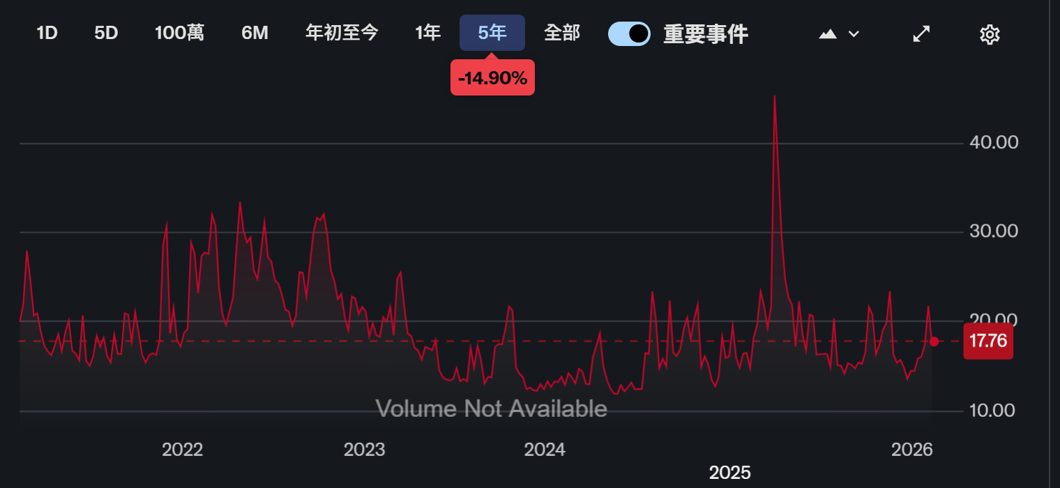 VIX :期權市場對未來 30 天標普 500 波動率預期,VIX長期平均約在19左右。若低於15,代表市場平靜;超過25,開始進入不安;若衝破30或40,多半是危機時刻,但它只能告訴你市場「表面的恐懼」,資料來源 : yahoo finance