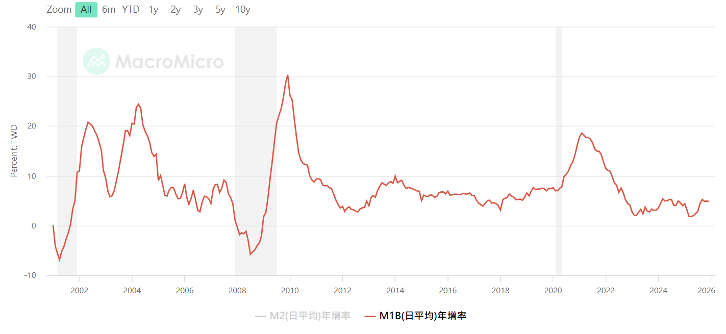 M1B年增率,若負值為警訊,資料來源:MacroMicro 財經M平方