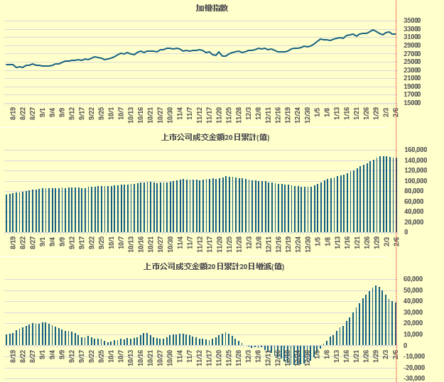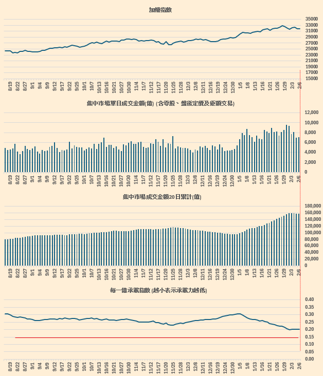 集中市場成交金額跟加權指數的對應。(留意每一億承載指數,越小表示承載力越低),概念來源 : 總大。