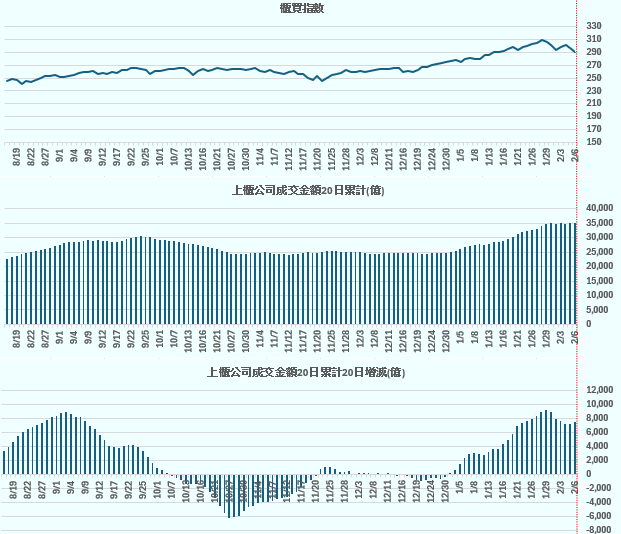 櫃買指數 vs 上櫃公司成交金額20日累計(億)