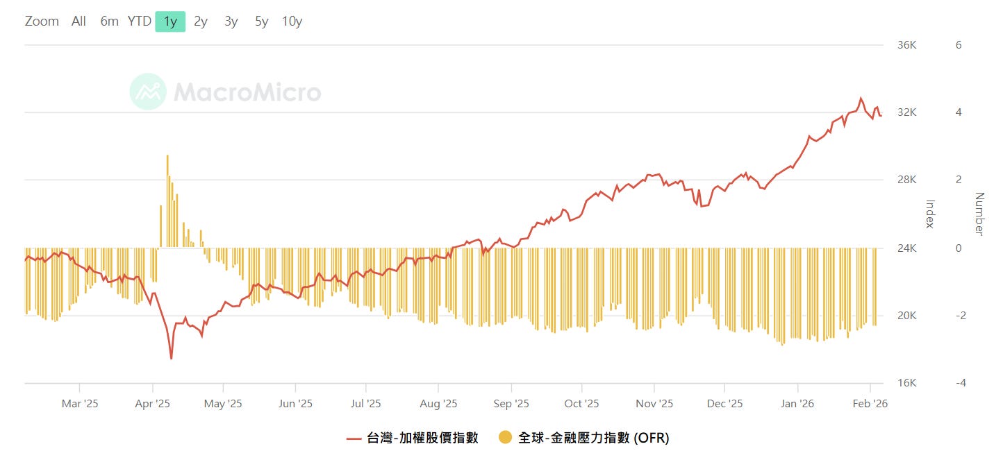 全球金融壓力指數vs加權,資料來源:MacroMicro 財經M平方,留意壓力指數從低點開始往上攀升