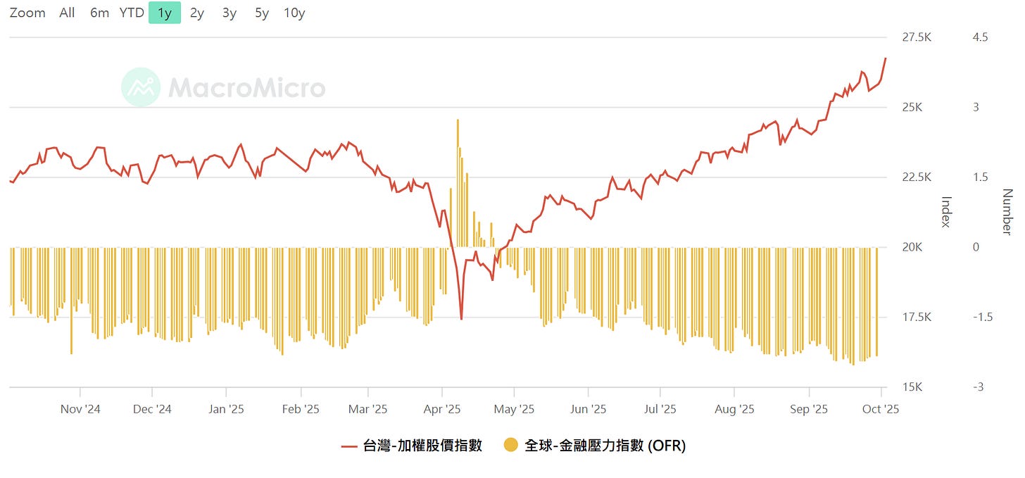 全球金融壓力指數vs加權,資料來源:MacroMicro 財經M平方,留意壓力指數從低點開始往上攀升
