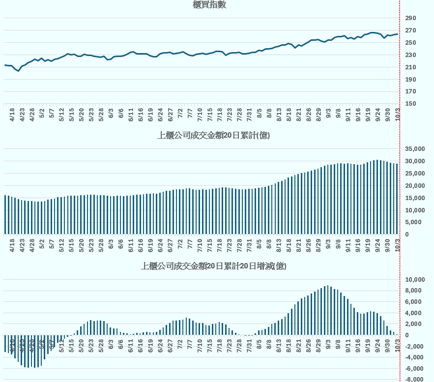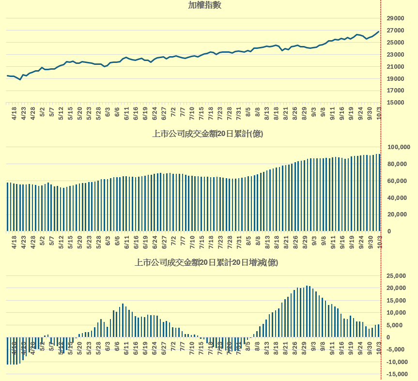 加權指數 vs 上市公司成交金額20日累計 vs 上市公司成交金額20日累計20日增減